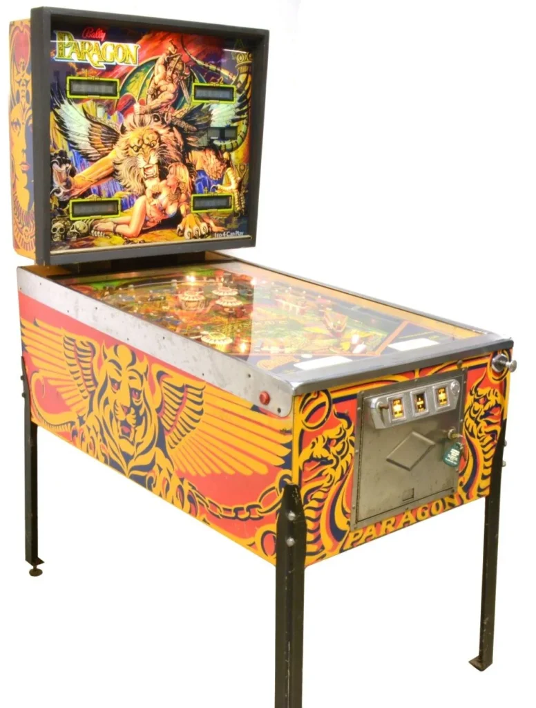 「Paragon」は、バリー初の本格的ワイドボディ機として知られる意欲作。 左右に分岐するプレイフィールド構造と高い難易度により、 70年代後期から80年代にかけてのピンボールが 「戦略と挑戦」を重視する方向へ進む転換点となった一台。 競技志向のプレイヤーから現在も高い評価を受けている。
